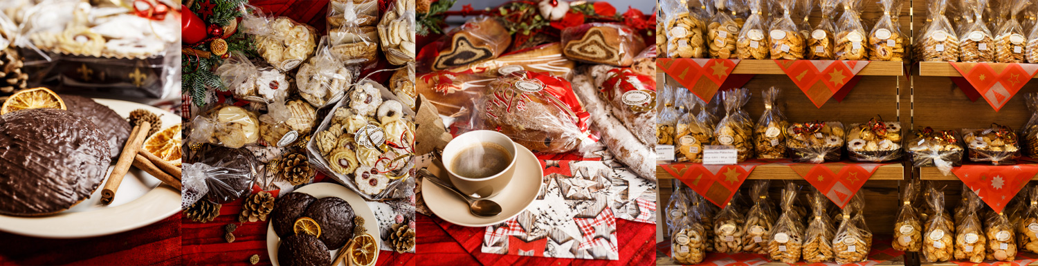 - Butterstollen mit Backmischung und Rosinen, Quarkstollen mit Backmischung und Rosinen, Nuß-/Mohnstollen, Elisenlebkuchen und einfache Lebkuchen, verschiedene Plätzchen